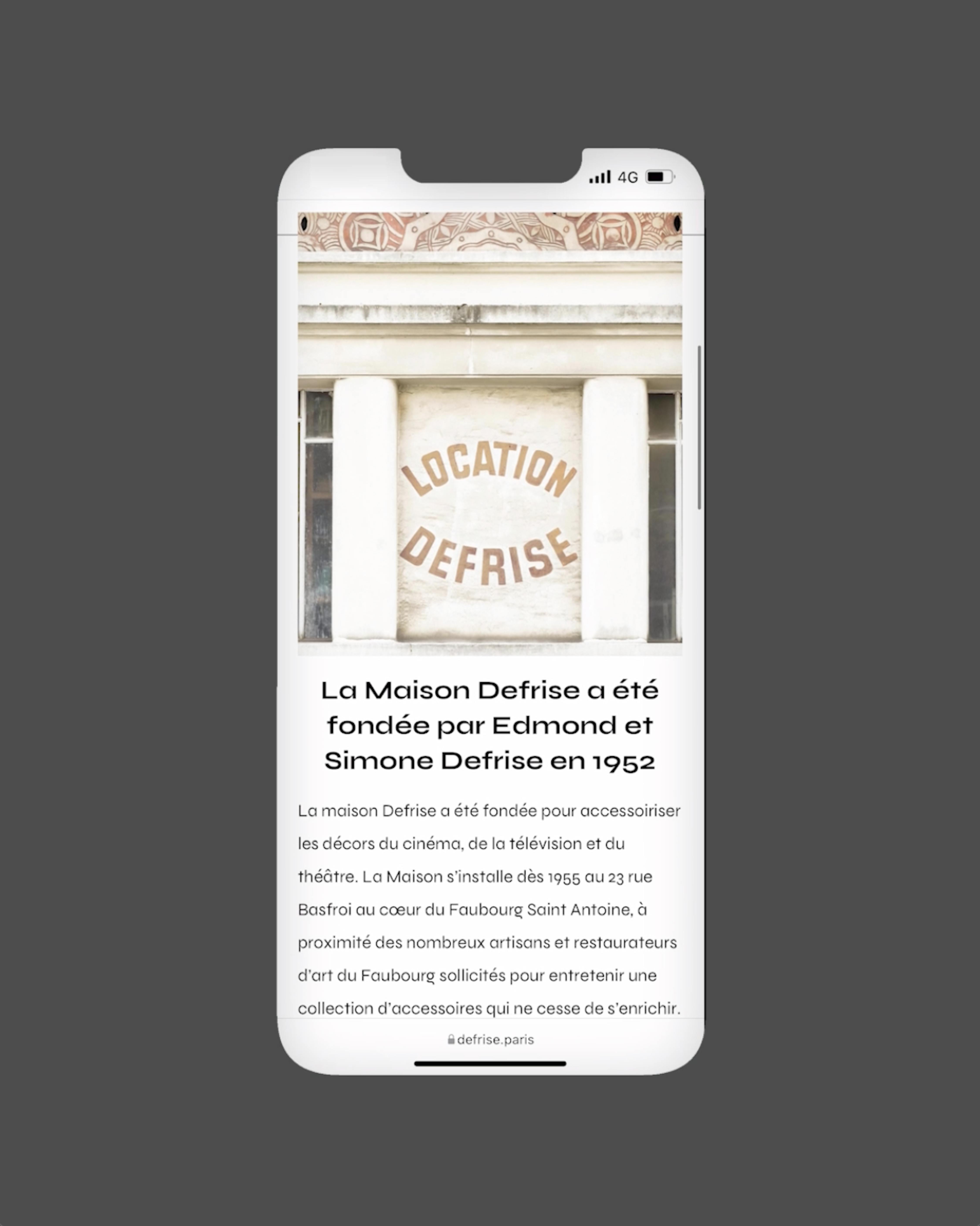 Le site internet Defrise.paris met en valeur l'histoire et les collections d'objets disponibles à la location. L'interface développé sur-mesure permet aux utilisateurs de comprendre le positionnement de la société et les services délivrées. Tout au long des pages, l'utilisateur découvre l'histoire de Defrise et puise son inspiration pour ses futurs projets. Des "call-to-actions" sont positionnés partout dans le site pour favoriser la prise de contact par les clients.